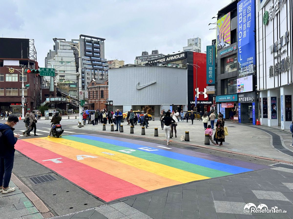 Als nächstes erreichten wir das Stadtzentrum, was von Malls und Videowänden dominiert war. Aber auch hier empfanden wir es als nicht so super modern, wie wir es uns vorgestellt hätten. Da sich Taiwan als sehr liberal zeigt, gibt es hier natürlich auch eine Rainbow Road.