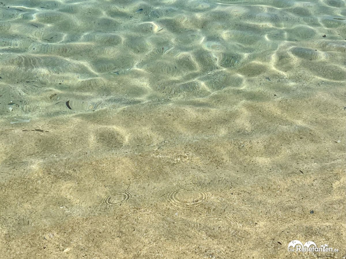 Ende Mai war das Meer zunächst noch etwas frisch aber letztlich erfrischend, schließlich war bei 28 Grad im Schatten durchaus schon Badewetter. Das Wasser war sehr klar, wurde aber schnell tief. Wenn die Fähren in den Hafen von Mykonos Stadt einfuhren, ergeben sich am Strand von Agios Stefanos hohe Wellen, so dass die ersten Strandreihen auch gerne man geflutet werden. Unsere Brilliance of the Seas hatten wir vom Strand auch gut im Blick.