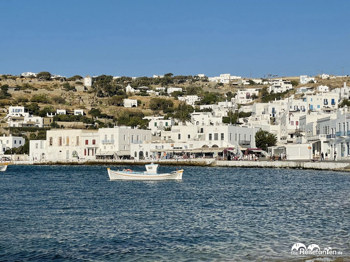 Für die Rückfahrt zurück nach Mykonos Stadt empfiehlt es sich, schon einige Minuten vor der Abfahrt an der Haltestelle zu sein. Denn auch hier: es dürfen nur so viele Passagiere einsteigen, wie es Sitzplätze gibt und man möchte ja schließlich nicht das Schiff verpassen. Wir hatten daher Puffer eingebaut, den wir zu Glück nicht brauchten und so hatten wir noch ein wenig Zeit, um kurz durch Mykonos Stadt zu schlendern. Vom Busbahnhof Fabrica kommt man schnell zu den bekannten Windmühlen und von dort weiter nach Little Venice.