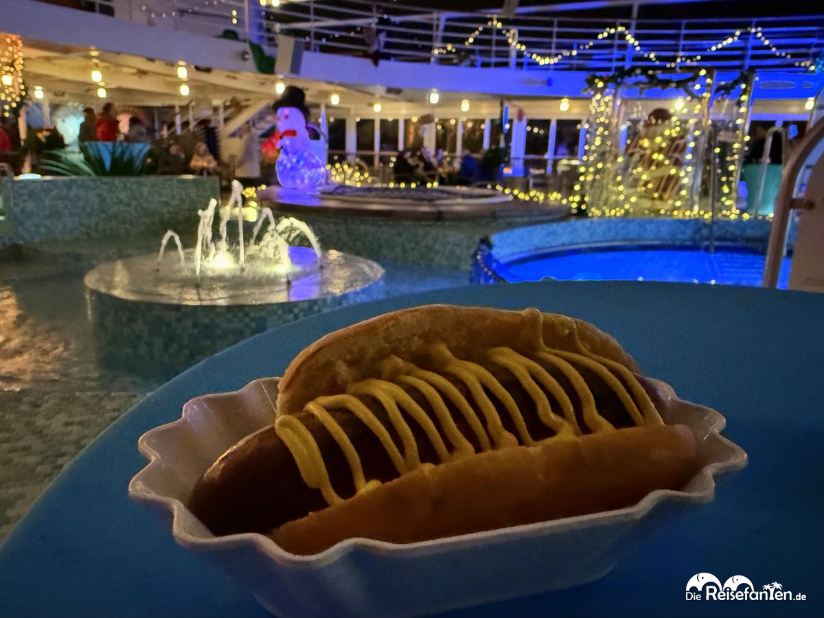 Besonders toll am Abend: die Crew der MS Artania hat sich im Rahmen der Adventskreuzfahrt etwas besonderes ausgedacht und an Deck einen eigenen Weihnachtsmarkt veranstaltet. Neben Suppe, Bratwurst und frisch gebrannten Mandeln gab es auch Punsch und Glühwein und sogar der Weihnachtsmann war zu Besuch. Abgerundet wurde das Spektakel durch eine tolle Deko und weihnachtlicher Musik. Das war ein richtig schöner Abend und ein toller Abschluss des Tages.