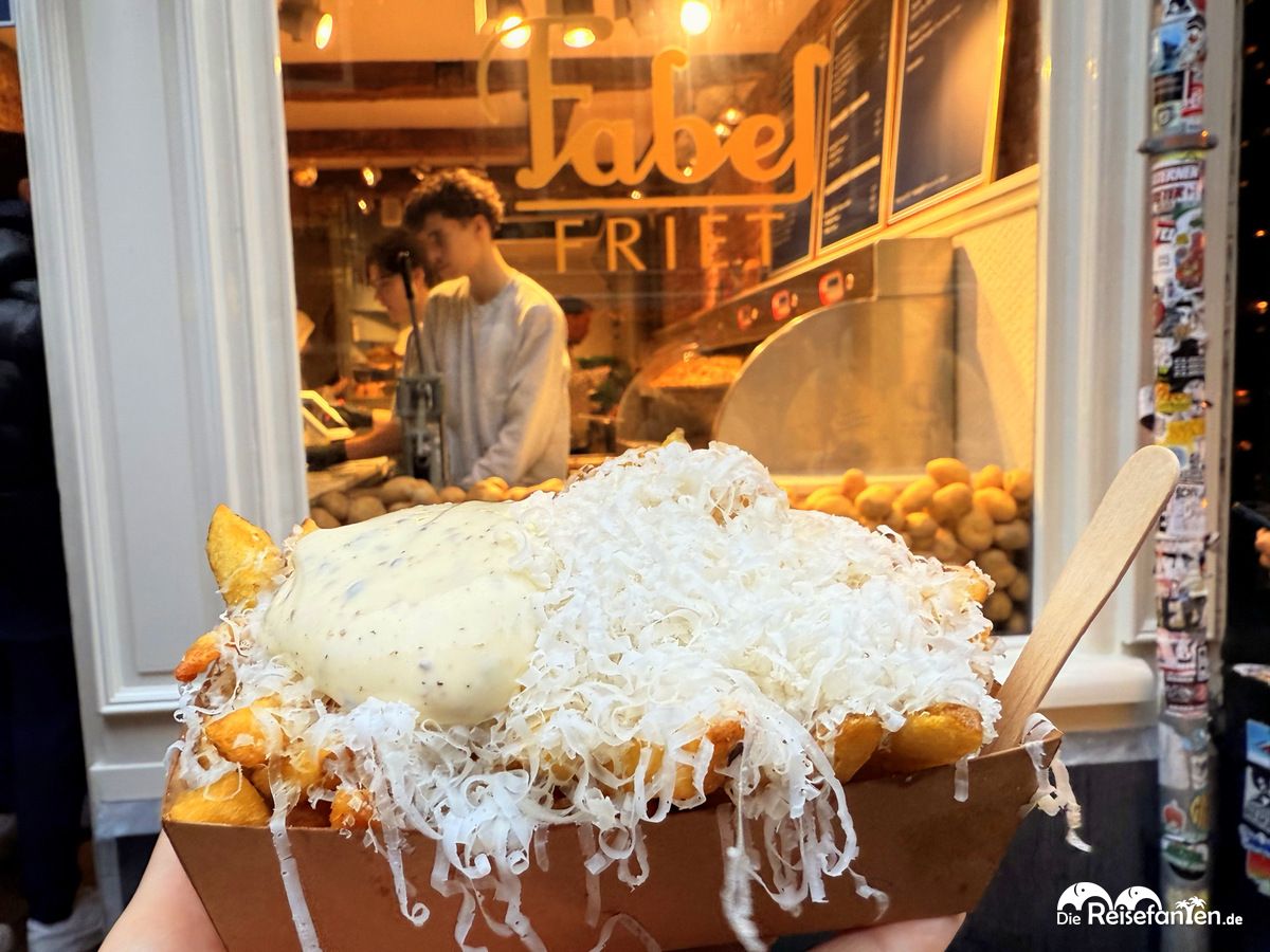 Wir waren nicht zum ersten Mal in Amsterdam und hatten daher auch kein straffes Sight Seeing Programm geplant und bekamen uns daher vom Museumsplein ganz gemütlich in Richtung Innenstadt. Wir hatten langsam etwas Hunger und wenn man schon in den Niederlanden ist, dann dürfen traditionelle Pommes nicht fehlen, die wir bei Fabel Frites fanden. Dort gab es leckere, frische Pommes mit Trüffelmayo und Parmesan. Schwer zu essen aber seeehr lecker! Man sollte sich aber etwas von der Gracht entfernen, denn die Möwen scheinen die Pommes auch für sich entdeckt zu haben. 😉