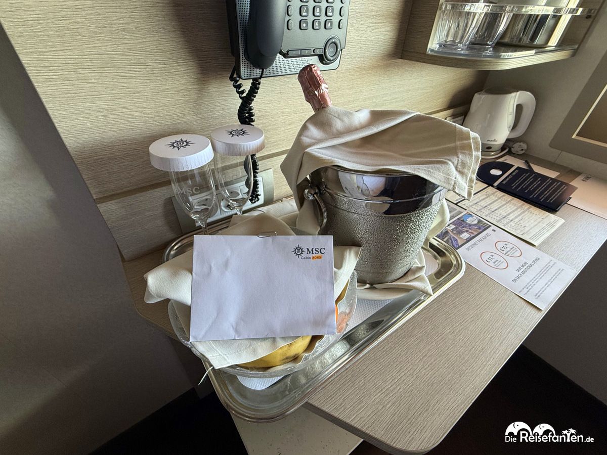Gebucht haben wir eine Glücks-Außenkabine. Dabei wählt man sich bei der Buchung keine konkrete Kabine aus, sondern bekommt diese von der Reederei in mindestens der gebuchten Kategorie zugeteilt. Wir hatten schließlich auf Deck 8 eine Junior-Außenkabine. Junior bedeutet in dem Fall, dass es die kleinste Kategorie der Außenkabinen ist. Das merkten wir vor allem daran, dass wir recht wenig Platz und vor allem wenig Ablageflächen hatten. Zudem war der freie Platz am Fenster nicht sonderlich gut genutzt. Das sah im Badezimmer anders aus, die Anordnung war sehr gut gewählt und generell war es natürlich schön, dass alles noch so schön neu war. Besonders freuten wir uns auch über den Kabinengruß!