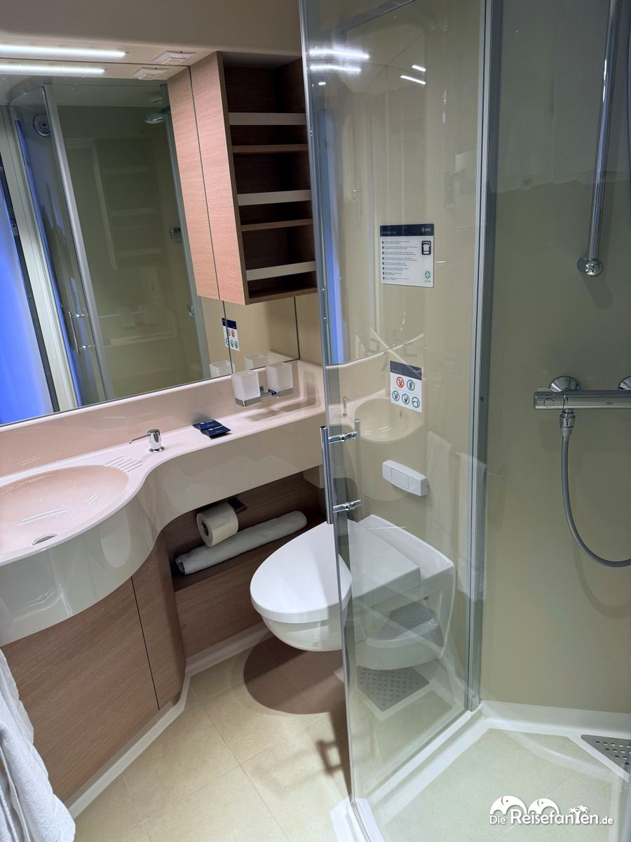Gebucht haben wir eine Glücks-Außenkabine. Dabei wählt man sich bei der Buchung keine konkrete Kabine aus, sondern bekommt diese von der Reederei in mindestens der gebuchten Kategorie zugeteilt. Wir hatten schließlich auf Deck 8 eine Junior-Außenkabine. Junior bedeutet in dem Fall, dass es die kleinste Kategorie der Außenkabinen ist. Das merkten wir vor allem daran, dass wir recht wenig Platz und vor allem wenig Ablageflächen hatten. Zudem war der freie Platz am Fenster nicht sonderlich gut genutzt. Das sah im Badezimmer anders aus, die Anordnung war sehr gut gewählt und generell war es natürlich schön, dass alles noch so schön neu war. Besonders freuten wir uns auch über den Kabinengruß!