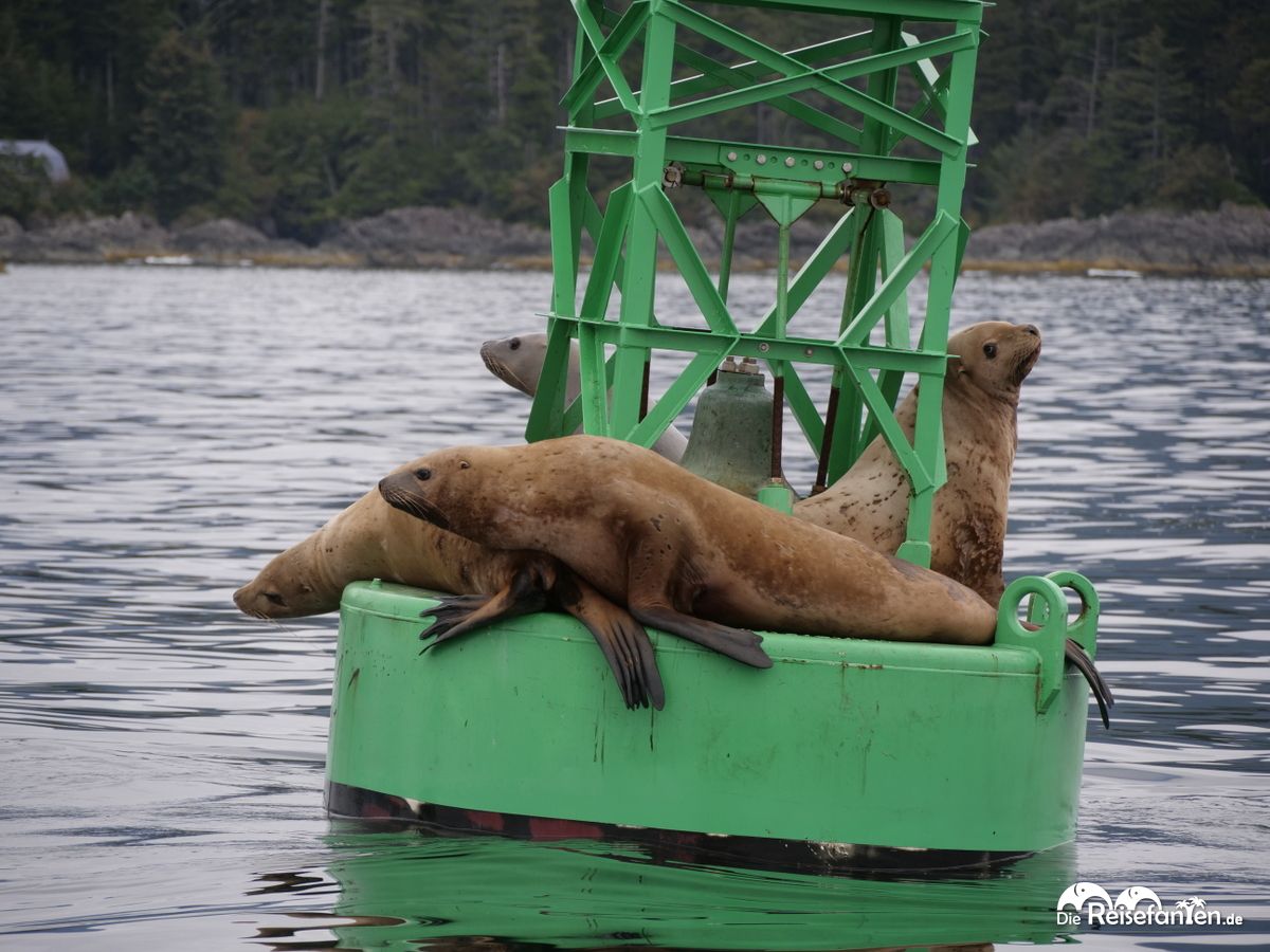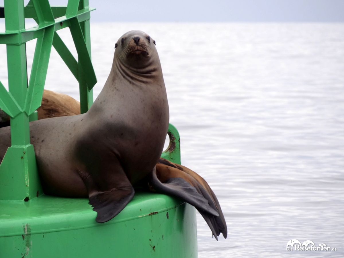 Nach den Walen fuhren wir auch noch an einer Boje vorbei, die von Seelöwen bevölkert war. Diese räkelten sich schön in der frühen Mittagssonne. Zwischendurch blökten sie auch herum und schlugen mit ihren Flossen an die Glocke, die eigentlich für starken Seegang gedacht war.