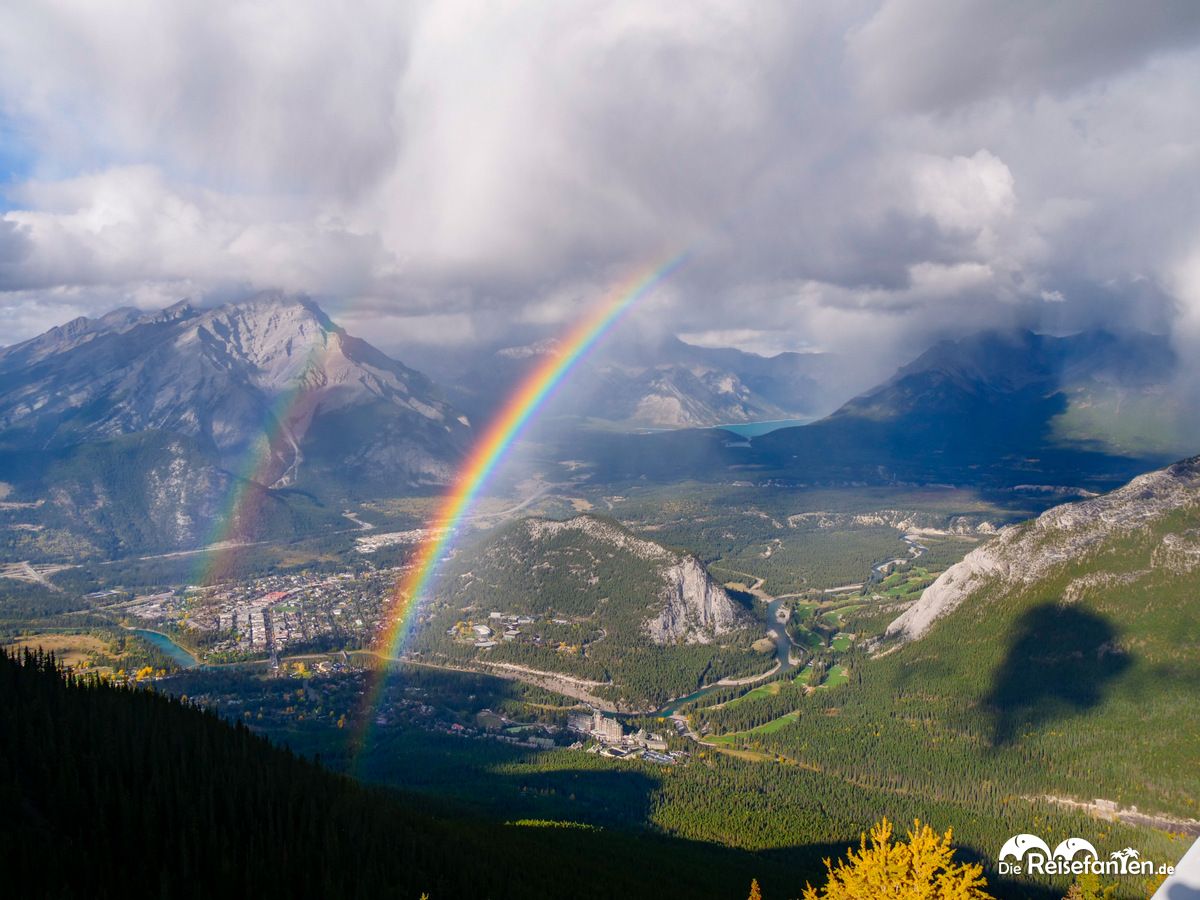 Als das Wetter wieder besser wurde, schafften wir es zeitlich nur noch zu einer Aussichtsplattform. Das Schöne dabei war aber: es bildete sich ein toller Regenbogen über das Bergpanorama der Rocky Mountains! Und es gab zudem einen doppelten Regenbogen. Das machte den Besuch schließlich einzigartig. Wenn wir die Chance gehabt hätten, wären wir noch länger geblieben aber wir mussten im gebuchten Zeitfenster wieder nach unten fahren.