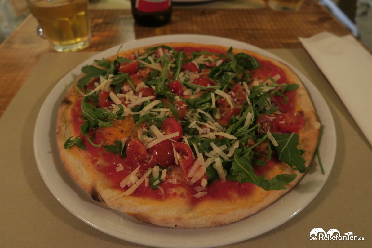 In der Pizzeria Lu Furat angekommen, wurden wir sofort sehr herzlich begrüßt. Es war noch früher Abend und das Restaurant daher noch nicht allzu voll, so dass wir problemlos einen Tisch bekamen und uns diesen zudem aussuchen konnten. Auf der Speisekarte befinden sich vor allem Pizzen – wir hatten aber auch nichts anderes erwartet. 🙂 Schon noch kurzer Zeit wurde uns das Essen serviert, seht selbst:
