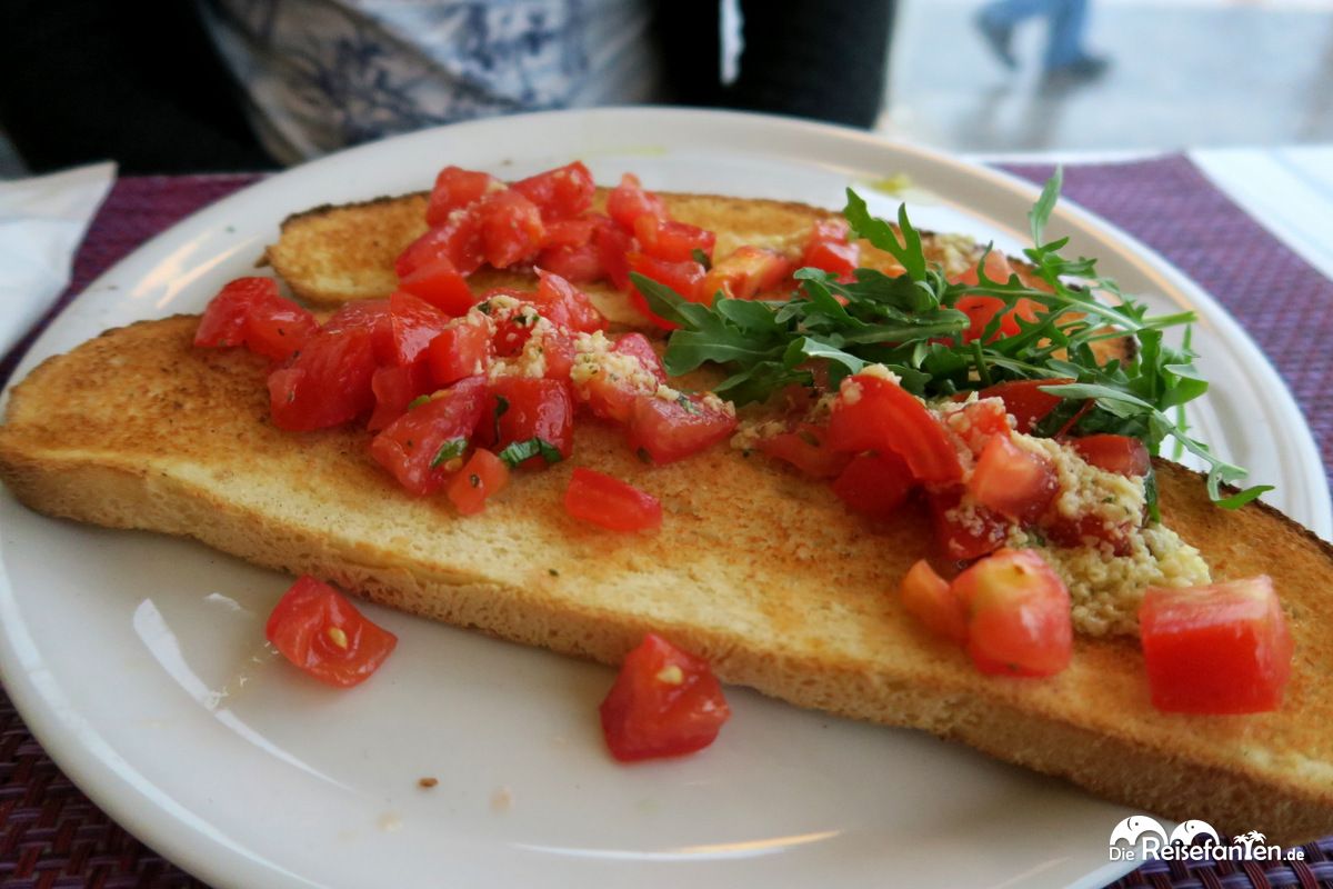 Wir entschieden uns zunächst für einen Latte Macchiato und einen Cappuccino. Die Getränke wurden schnell serviert und waren italienisch köstlich. Unser Hunger war noch nicht so groß, dennoch bekamen wir beim Anblick der großen Bruschetta Portionen am Nebentisch Appetit und bestellten die klassische Variante, sowie Bruschetta mit Rucola und Parmesan. Beides wurde schnell serviert und wir waren sehr zufrieden mit unserer Wahl, denn es war sehr lecker. Bei Sonnenschein wären unser Platz und die Aussicht zwar noch schöner gewesen, doch auch bei Regenwetter ist die Ristorante Pizzeria Garden in Malcesine einen Besuch wert.