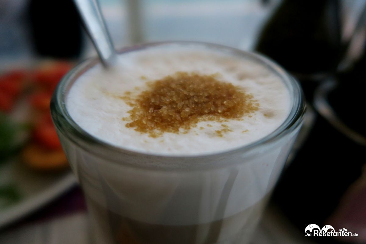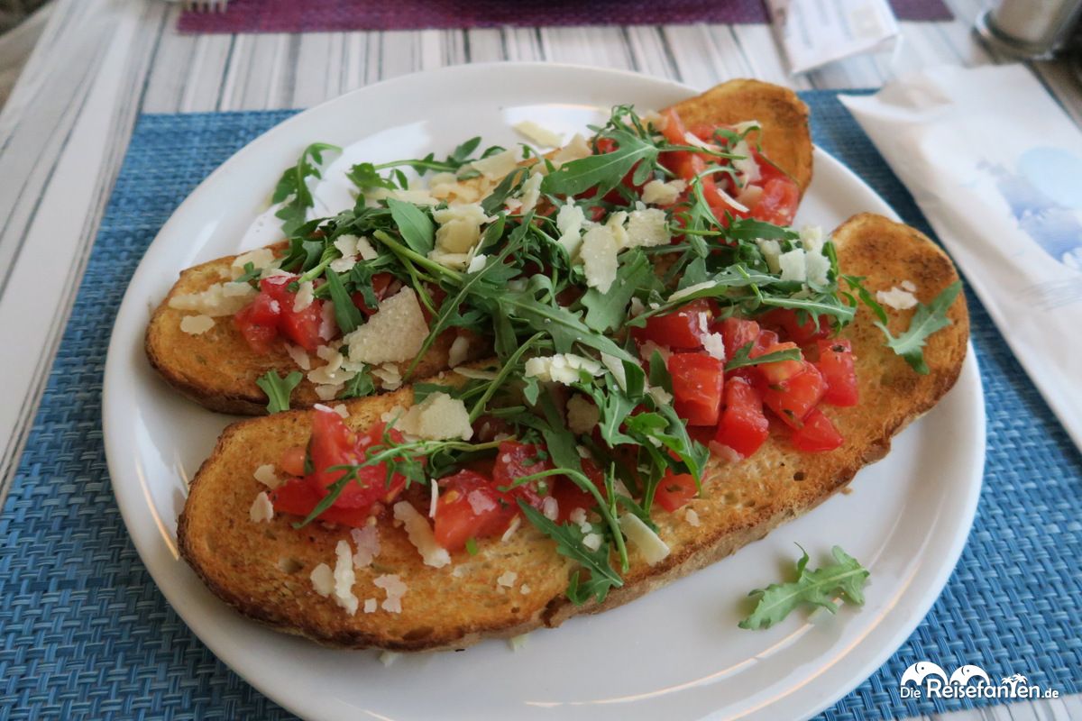 Wir entschieden uns zunächst für einen Latte Macchiato und einen Cappuccino. Die Getränke wurden schnell serviert und waren italienisch köstlich. Unser Hunger war noch nicht so groß, dennoch bekamen wir beim Anblick der großen Bruschetta Portionen am Nebentisch Appetit und bestellten die klassische Variante, sowie Bruschetta mit Rucola und Parmesan. Beides wurde schnell serviert und wir waren sehr zufrieden mit unserer Wahl, denn es war sehr lecker. Bei Sonnenschein wären unser Platz und die Aussicht zwar noch schöner gewesen, doch auch bei Regenwetter ist die Ristorante Pizzeria Garden in Malcesine einen Besuch wert.