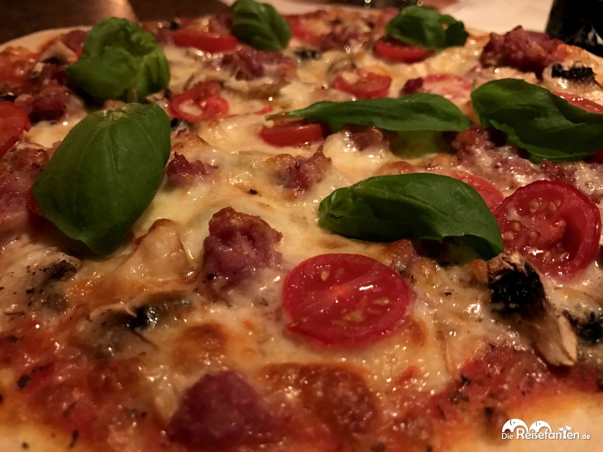 Von der Karte wählten wir eine Pizza Salsiccia und die Pasta Spinaci mit Lachs. Nach einer nur kurzen Wartezeit wurde uns das Essen auch schon serviert. Die Pasta war al dente, die Sauce pikant gewürzt und der Lachs rundete das Gericht positiv ab. Die Pizza war reichhaltig belegt und der Boden recht dünn, was wir am liebsten mögen. Entgegen der Angaben auf der Karte war die Pizza auch mit Champignons belegt, was uns gut gefallen hat aber nicht alle mögen ja bekanntlich Pilze.