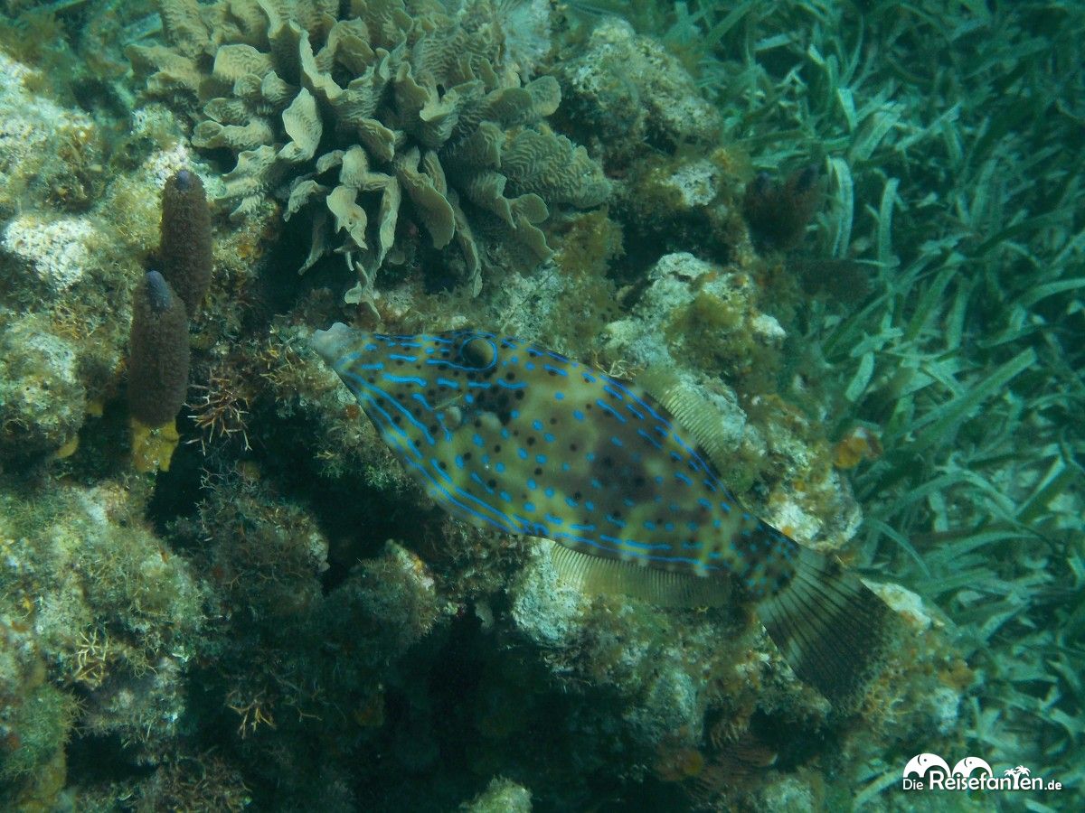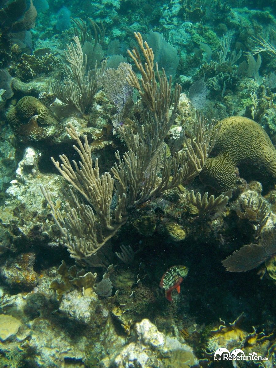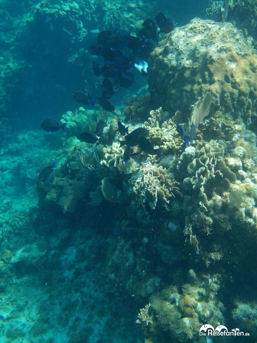 Schnorchelausflug mit dem Boot an der West Bay auf RoatanDie West Bay ist ein schöner, typisch karibischer Strandabschnitt und da hier hauptsächlich Hotelgäste am Strand verweilten, war zu unserer Zeit sehr wenig los. Kaum angekommen, wurden wir auch schon angesprochen, ob wir an einem Schnorchelausflug teilnehmen möchten. Für eine Fahrt zum Blue Channel inklusive Schnorchelstopp sollten wir 30 USD pro Person bezahlen. Da wir aber unsere eigene Ausrüstung dabei hatten, konnten wir den Preis pro Person noch auf 20 USD nachverhandeln und dann ging es auch schon los. Wir cremten uns noch schnell ein und suchten unsere Sachen zusammen und dann fuhren wir zusammem mit einer brasilianischen Familie und einem Guide zu unserer Schnorchelstelle. An der Schnorchelstelle angekommen, machte sich unser Guide ebenfalls bereit und kam mit uns ins Wasser. Die brasilianische Familie wurde noch mit Schwimmwesten ausgestattet, wir lehnten dankend ab. Sehr positiv war, dass kaum andere Boote vor Ort waren. Im Wasser folgten wir dann dem Guide und schnorchelten letztendlich eine Schleife zurück zum Boot. Etwas über eine Stunde dauerte unsere Schnorcheltour, auf der wir die brasilianische Familie ziemlich verloren (sie hielt sich dann hauptsächlich in Bootsnähe auf) und mit dem Guide alleine unterwegs waren. Er zeigte uns u.a. eine sehr große Muschel sowie bunte Fische. Insgesamt wirkte das Riff aber doch etwas verlassen, so dass wir uns bis heute nicht sicher sind, ob wir wirklich am bekannten Blue Channel waren.