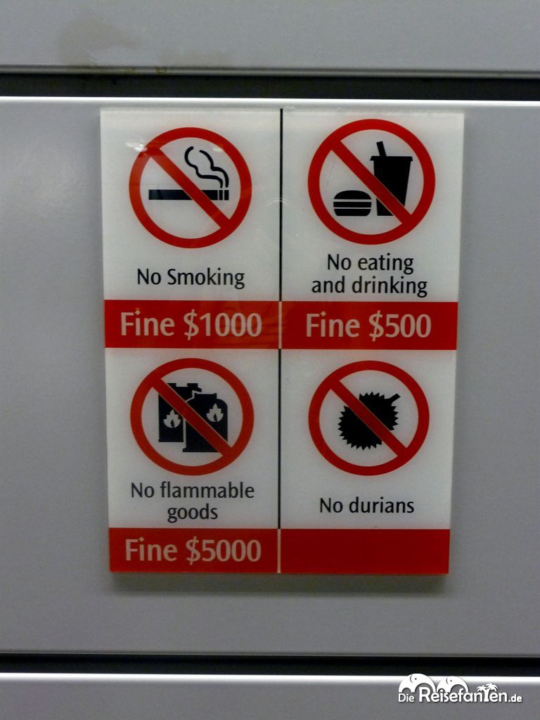Der Stadtstaat Singapur ist so gar nicht das, was man sich unter Asien vorstellt: Chaos, Unordnung und Müll wird man hier nicht finden. Ganz im Gegenteil, hier geht es sehr gesittet zu, es ist sehr sauber, alles scheint geregelt zu sein und es gibt zahlreiche Verbotsschilder mit entsprechenden Hinweisen darüber, was verboten ist und was ein Verstoß kostet. Man hat teilweise tatsächlich das Gefühl, in einer europäischen Großstadt unterwegs zu sein. Singapur ist top modern und die Infrastruktur ist hervorragend: mit der computergesteuerten Metro kommt man in Singapur gut und preiswert von A nach B.