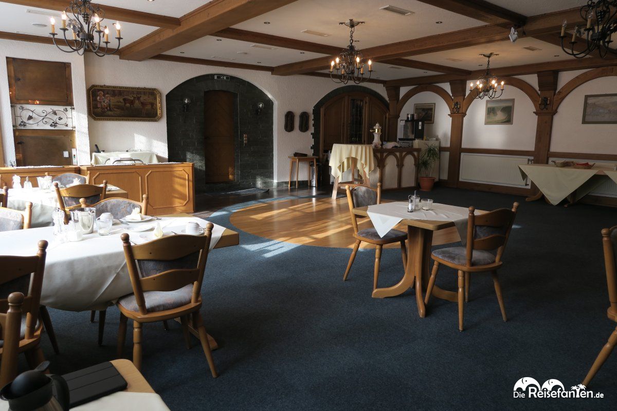 Das Frühstück war schön angerichtet und fand in einem sehr großzügig dimensionierten Saal statt, in dem man sich fast etwas verloren vorkommt. Über Platzmangel kann man sich hier wahrlich nicht beschweren. Neben frischen Brötchen, Brot und diversen Käse- & Wurstsorten standen u.a. frischer, selbstgemachter Obstsalat, Joghurts und die üblichen Cerealien zur Auswahl. Kaffee, Tee und Säfte rundeten das Angebot ab. Als Bonus gab es zudem noch die aktuelle Zeitung der Region.