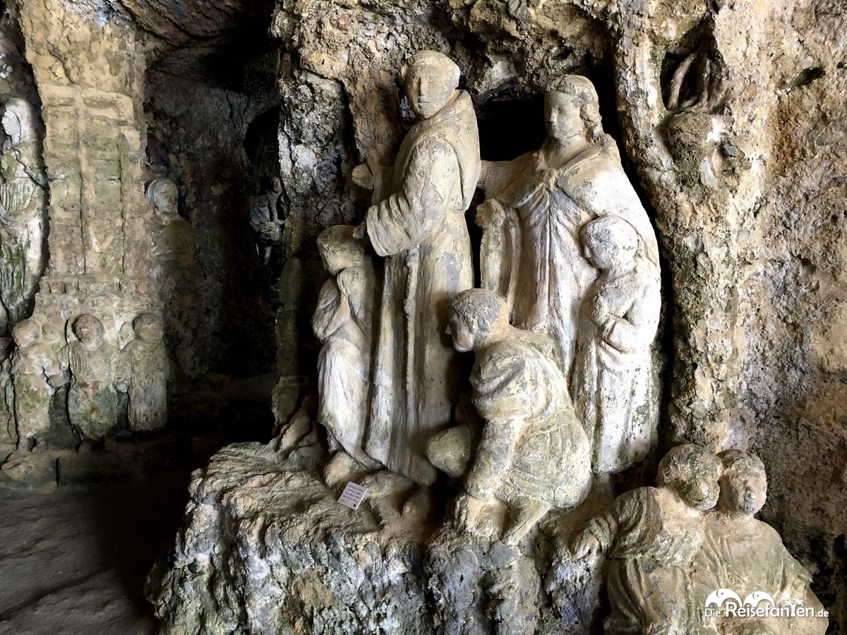 Laut einer Legende wurde Mitte des 16. Jahrhunderts ein neapolitanisches Schiff von einem schweren Sturm überrascht. Die Seemänner beteten vor einem Gemälde der Madonna von Piedigrotta darum, vom Sturm verschont zu bleiben. Sollten sie gerettet werden, würden sie zu Ehren der Madonna eine Kapelle errichten. Das Schiff sank zwar aber die Matrosen schafften es an Land. Sie hielten ihr Versprechen und errichteten an dieser Stelle eine kleine Kapelle. Um 1880 entschied sich dann ein lokaler Künstler dazu, die Höhle nach und nach zu vergrößern. Dabei baute er zwei große Bereiche aus und erschuf Statuen. Alles kann heute besichtigt werden und so ließen wir unsere Blicke durch den Innenraum der Kirche wandern.