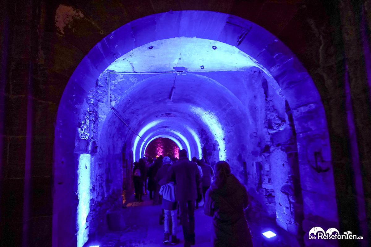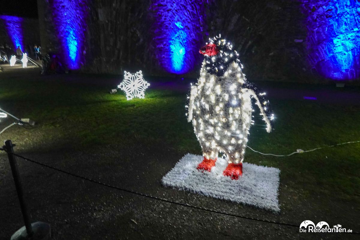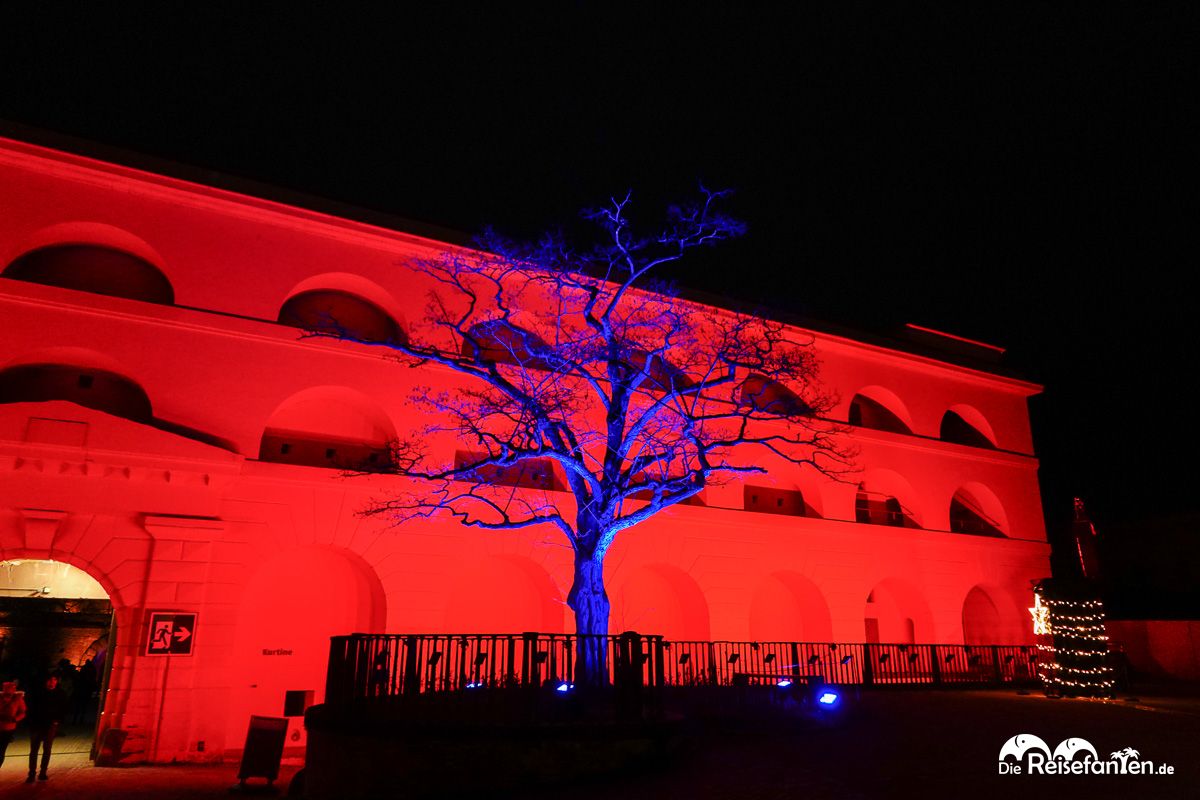 Mit der Seilbahn machten wir uns auf den Weg über den Rhein, die uns in etwa zehn Minuten direkt zur Festung brachte. Oben angekommen, waren wir gleich am Eingang zur Festung und konnten unser zuvor online auf der Website christmas-garden.de erworbenes Ticket vorzeigen, um sofort in das Lichtermeer einzutreten.