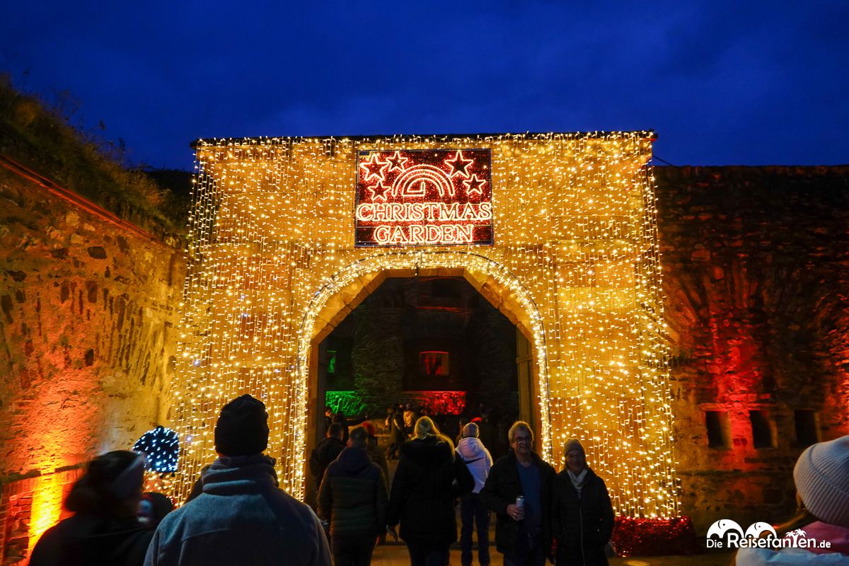Nach einer bereits tollen ersten Tageshälfte auf dem Koblenzer Weihnachtsmarkt zog es uns zur anderen Rheinseite, um die magische Atmosphäre des Christmas Garden auf der Festung Ehrenbreitstein zu erleben. Mit Einbruch der Dämmerung standen uns dort atemberaubende Lichtinstallationen und Klangwelten offen – gegen Eintritt versteht sich.