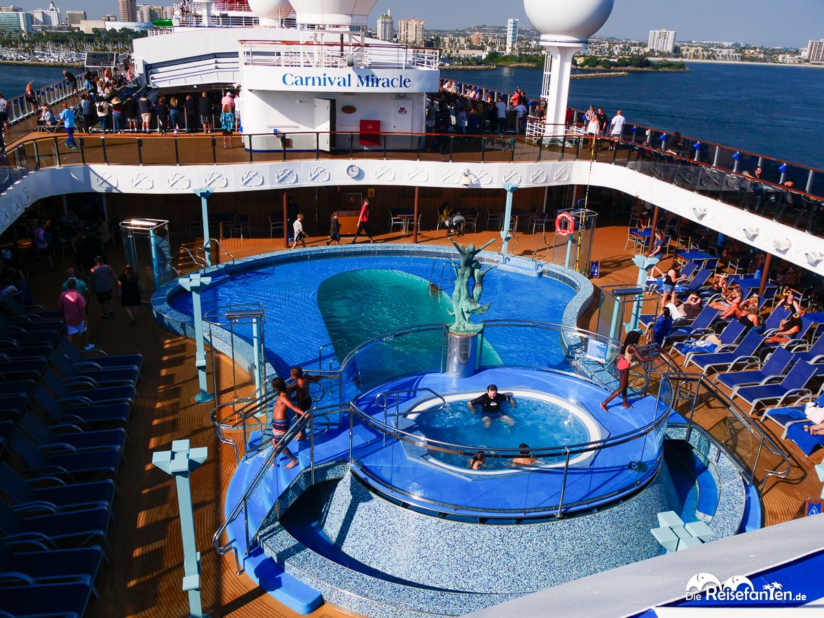 Mit unserem Mango Swirl in der Hand machten wir uns auf den Weg zum Sonnendeck. Die frische Meeresbrise und der endlose Horizont begrüßten uns, während die Carnival Miracle langsam aus dem Hafen glitt. Wir beobachteten die Wellen, die sich hinter dem Schiff brachen, und ließen die ersten Eindrücke auf uns wirken. Die Ruhe und Weite des Ozeans versprachen schon das nächste Abenteuer.