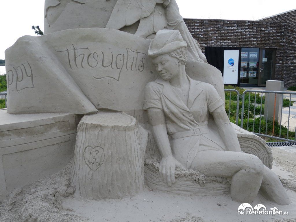 Hier sieht man den Entstehungsprozess einer Sandskulptur – vom Sandblock bis hin zur detailliert ausgearbeiteten Skulptur.