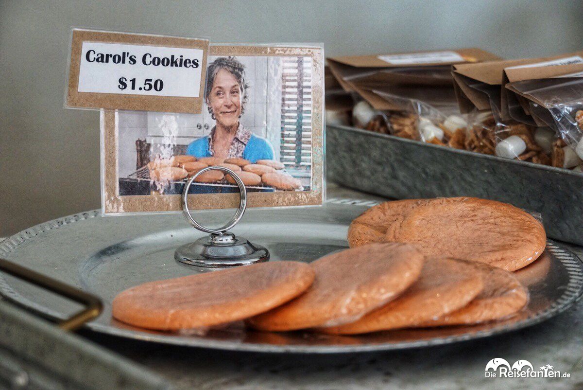 Kurzum, die Tour hat uns sehr gut gefallen, auch wenn Andrea die angeblichen 2.5 Stunden ordentlich überzogen hat. Zum Abschluss gingen wir dann nochmal in das Ladengeschäft der Tour (welches übrigens auch schon als Drehort hergehalten hat!), staunten über die vielen Pins in der Besucher-Karte, von wo aus überall schon Fans zu Besuch waren und erhielten sogar noch Silikonbänder dafür, dass wir die Tour überlebt (und einer von uns mit Warnweste den Schluss der Gruppe gebildet) hatten. Übrigens werden dort auch noch andere Touren angeboten, sogar eine Tour mit Live-Acting Anteilen ist im Programm. Im Anschluss gingen wir dann noch rüber zur Bäckerei, die uns unsere Andrea alias Jeni noch empfohlen hatte und kauften uns zum Abschluss erst einmal die leckeren Carol’s Cookies. Von uns eine klare Empfehlung – sowohl die Kekse als auch die Tour. 🙂