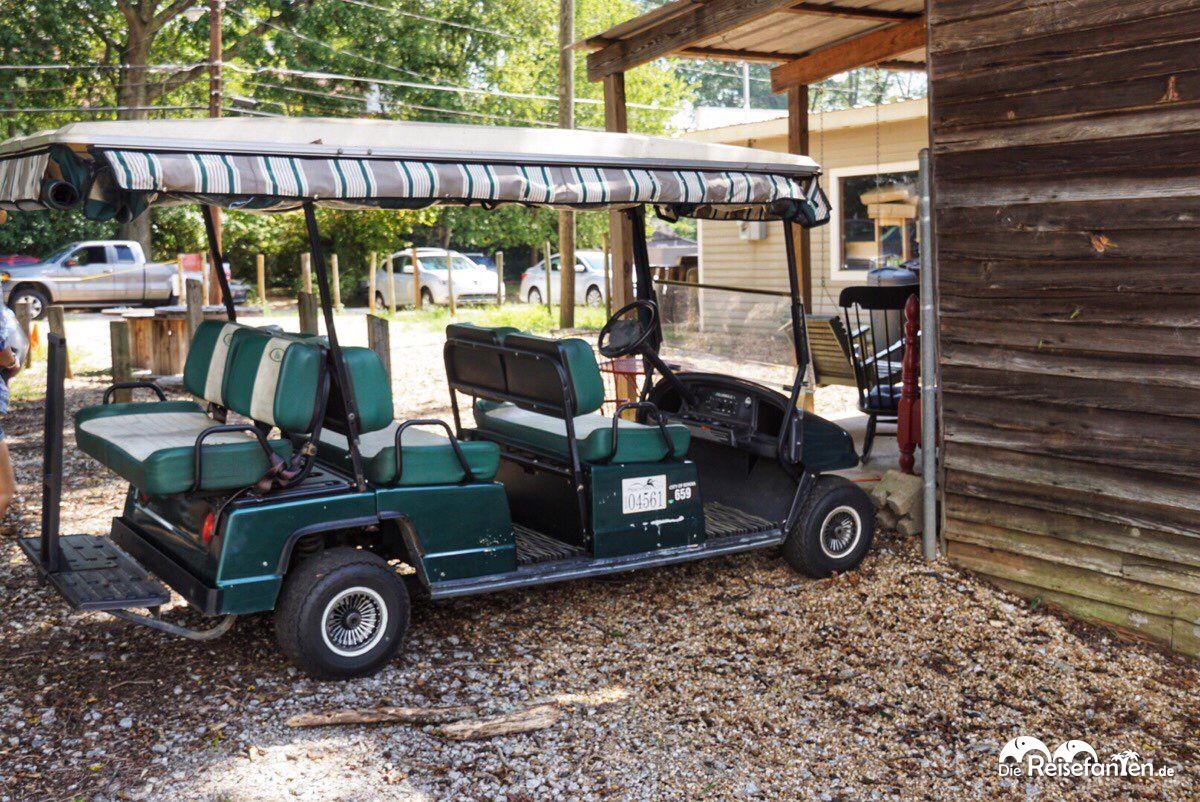 Doch der Reihenfolge nach: nach dem für die USA typischen, unkomplizierten Parkplatzsuche begaben wir uns in den hübschen Laden der Georgia Tour Company in der 53, Main Street, die mit “The Touring Dead” spezielle Walking Tours zu dieser TV-Serie anbietet. Zwar wurden in Senoia und Umgebung auch noch zahlreiche andere Produktionen wie “Grüne Tomaten”, “Friedhof der Kuscheltiere 2” oder “Drop Dead Diva” gedreht, “The Walking Dead” ist aber das aktuellste und sorgt natürlich für den größten Medien- und Fan-Hype. Daher hat sich die Georgia Tour Company auch hierauf spezialisiert und bietet offiziell 2.5-stündige Touren an, die sowohl Fußwege als auch den Transport mit einem elektrischen Cart beinhalten. Zum Preis von 25 USD pro Nase (Kinder unter 6 sind kostenlos) geht es praktisch jeden Tag ab 10 Uhr morgens los mit mehreren Touren am Tag. Die männlichen und weiblichen Tourguides sehen dabei erstaunlicherweise den Darstellern der Serie recht ähnlich, besonders bei dem Andrew Lincoln-Verschnitt mussten wir wirklich mehrmals hinsehen – aus der Ferne könnte man wirklich meinen, Rick Grimes führt gerade eine Horde Fans durch die Stadt.