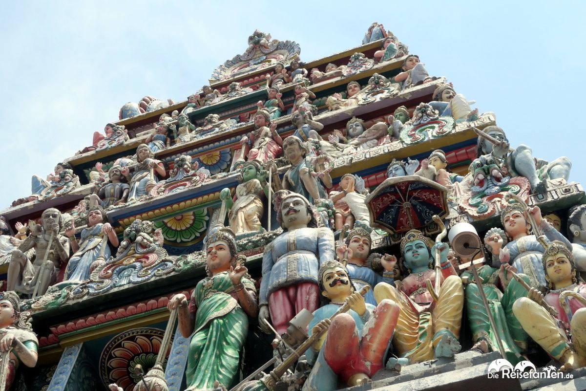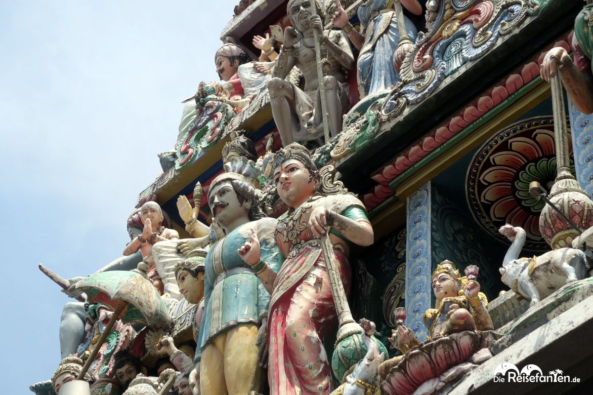 Zum anderen gibt es noch den hinduistischen Sri Mariamman Tempel, der durch seine schönen und aufwändig gestalteten, unzähligen Figuren an der Fassade auffällt. Ein wahrer Hingucker.